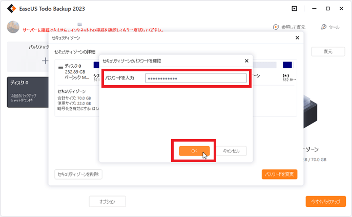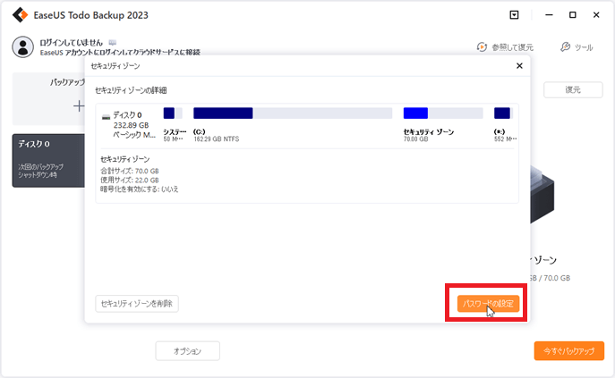 バックアップが保管されているセキュリティゾーンにパスワードを設定することができます。