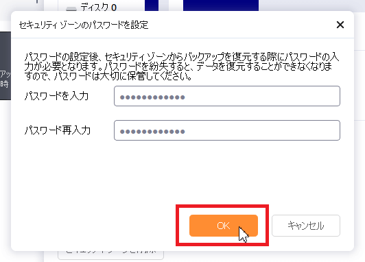 「セキュリティゾーンのパスワードの設定」画面が表示されるので、パスワードと確認用のパスワード入力して[OK]をクリックします。