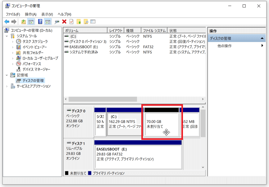 [コンピュータの管理]の[ディスクの管理]で確認できます。