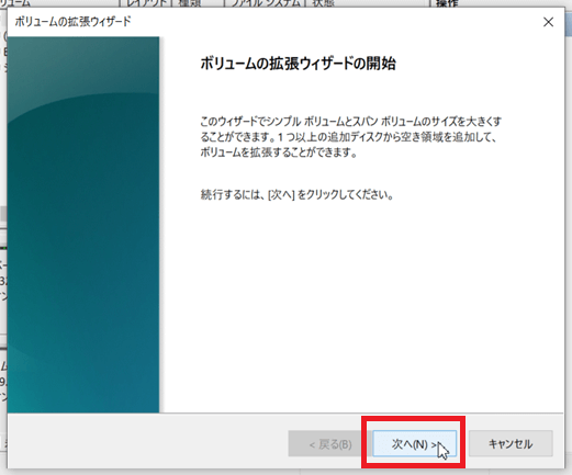 [ボリューム拡張ウィザード]は、基本[次へ]で[完了]までデフォルのままで良いかと思います。