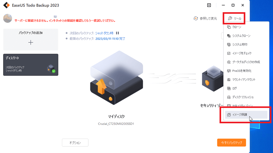 「イメージ保護」機能を有効化する場合は、EaseUS Todo Backupを起動して[ツール]から[イメージ保護]をクリックします。