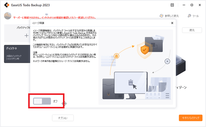 「イメージ保護」機能は、EaseUS Todo Backup からのバックアップファイルへの読み込み/書き込みのみを許可し、他のプログラムからの変更を抑止させることができます。