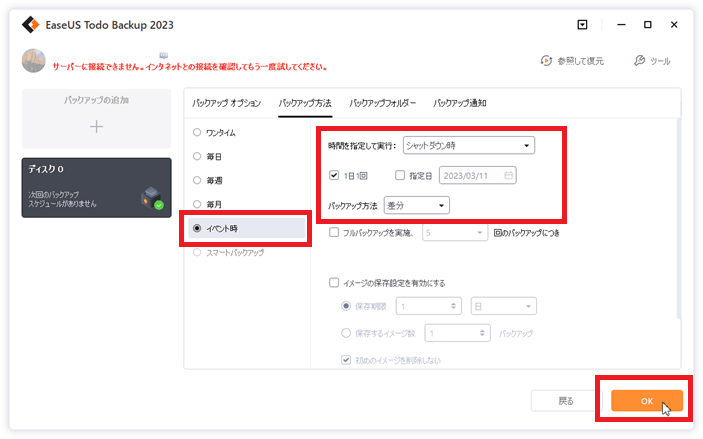 [1日1回]チェックボックスをオンにし、[バックアップ方式]に[差分]を選択し[OK]をクリックします。