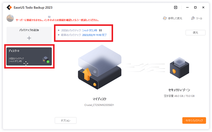 有償版に切り替えた最大の理由は、「セキュリティゾーンと呼ばれる隠しパーティションを作成してバックアップを保管できること」とPCのシャットダウンしたタイミングでバックアップが実行するようにスケジュール設定できることです。