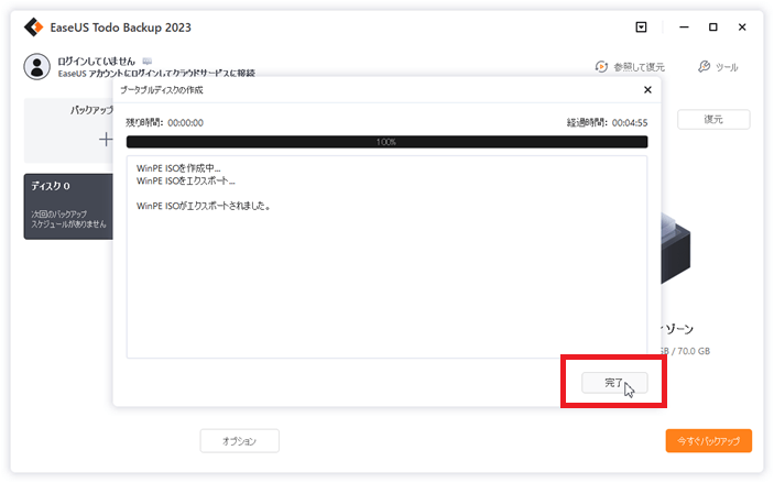 ブータブルディスクの作成処理が開始され、完了すると[完了]ボタンが表示されるので[完了]をクリックします。