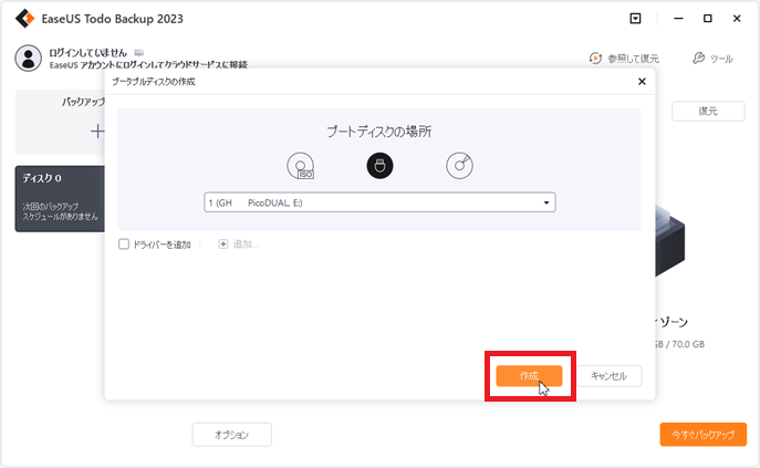 [ブータブルディスクの作成]画面に戻ったら[作成]をクリックします。