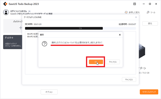 ブータブルディスク作成先のUSBメモリやメディアがフォーマットされることを示すメッセージが表示されるので、問題なければ[OK]をクリックします。