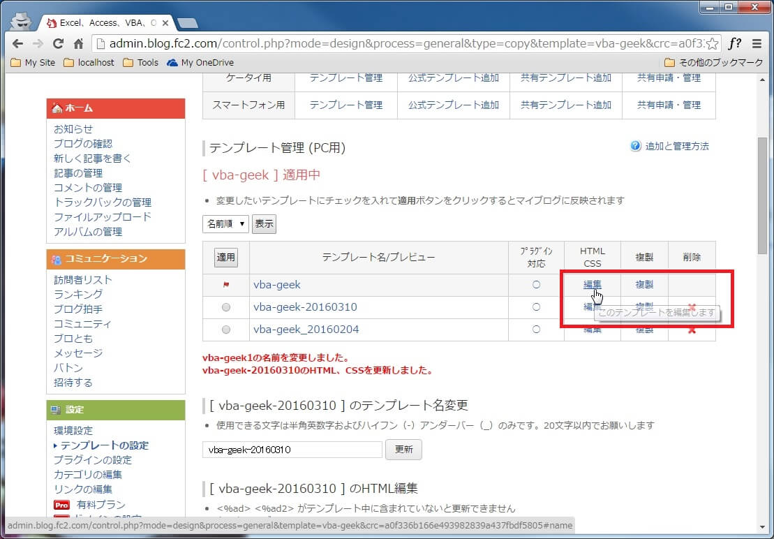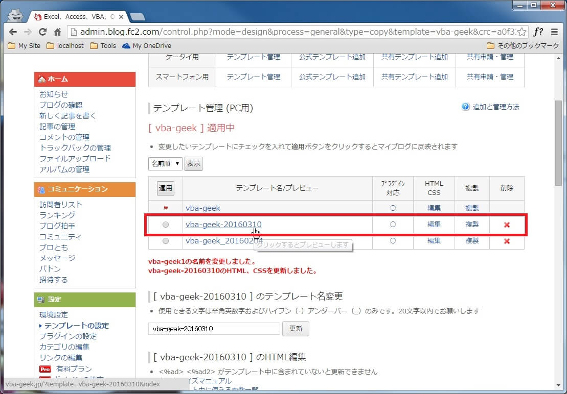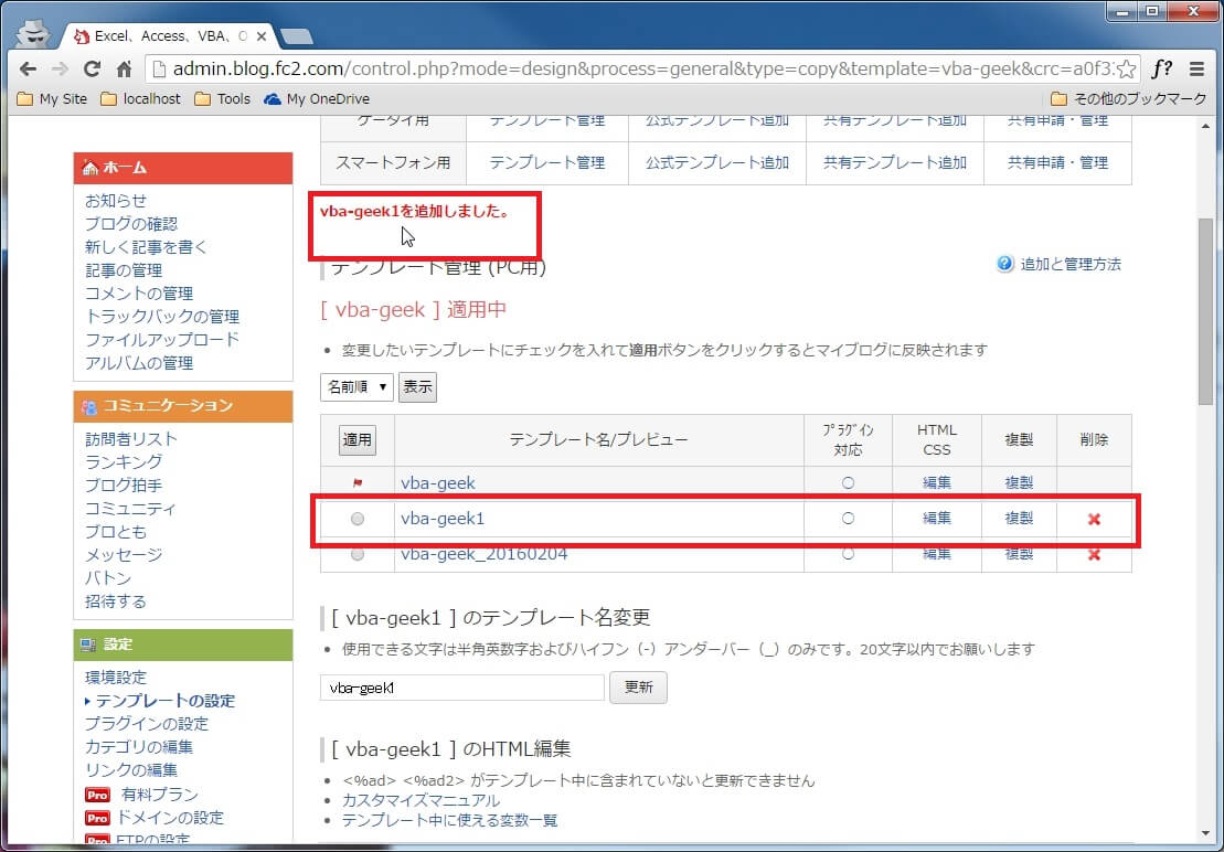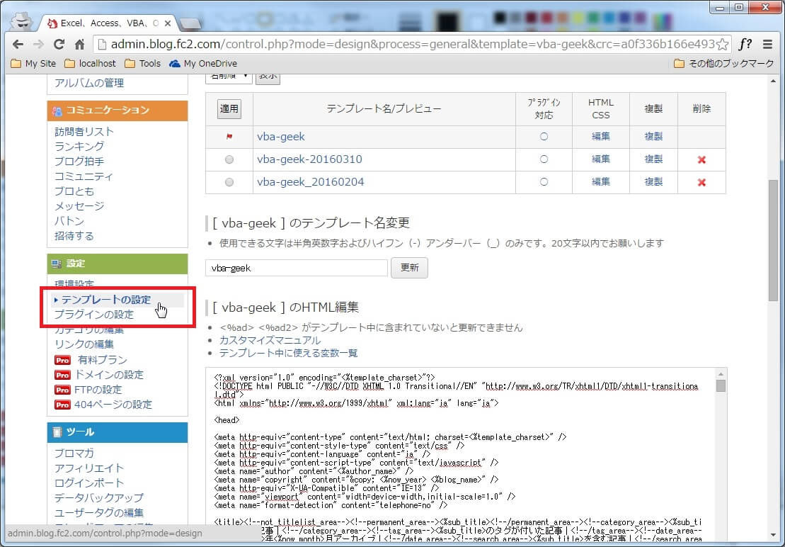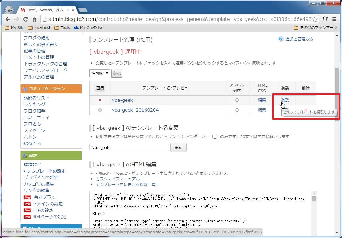 FC2ブログをカスタマイズする際にテンプレートを編集する前に複製をしてバックアップを取る手順について覚書。