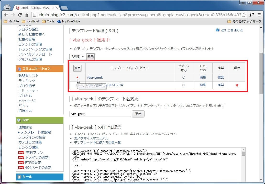 このままだと複製したテンプレートの編集画面となっているため、適用中(赤い旗)のテンプレートの[編集]をクリックし適用中のテンプレートの編集画面に戻します。
