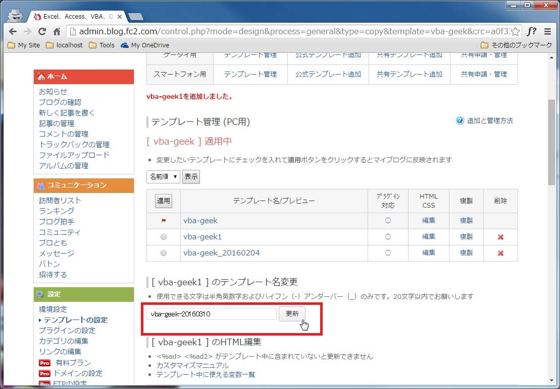 複製したテンプレートの名前を変更したい場合は、[テンプレート名変更]のテキストボックスに任意の名前を入力し、[更新]ボタンをクリックします。