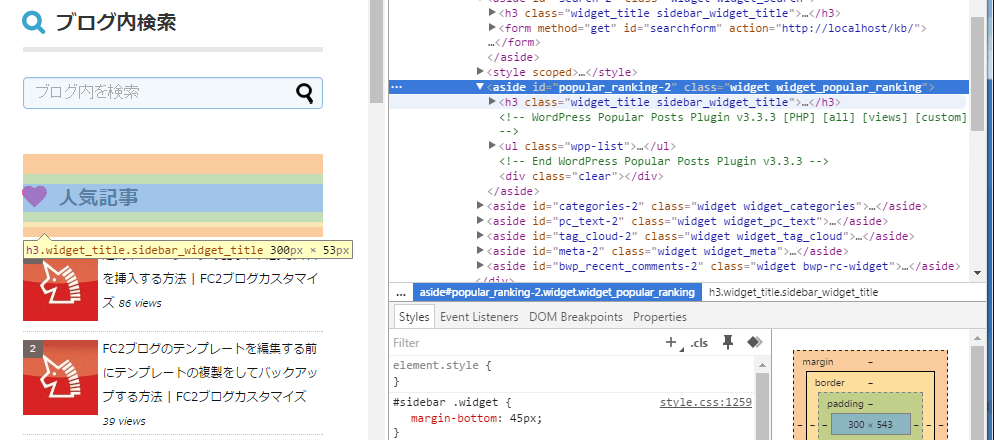 ウィンドウに表示された内容を見ると、「[S]人気記事」サイドバーのタイトルはh3タグが使われており、サイドバーの名前は"popular_ranking-2"であることがわかります。