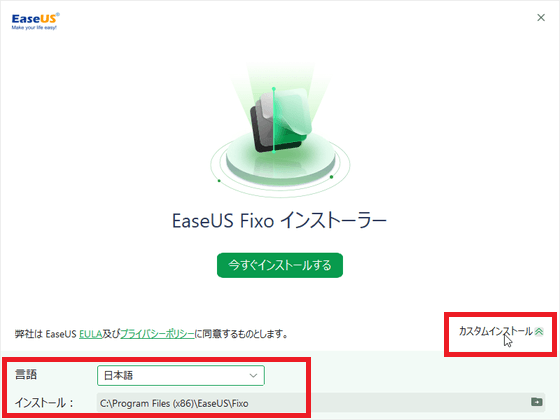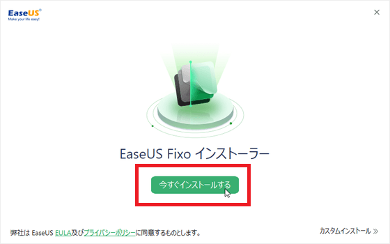 EaseUS Fixoのインストーラーが起動するので[今すぐインストール]をクリックします。