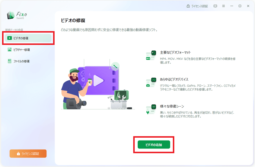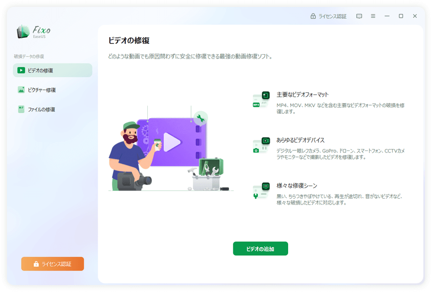 EaseUS Fixoを起動して、左のメニューから[ビデオの修復]をクリックし、[ビデオの追加]をクリックします。