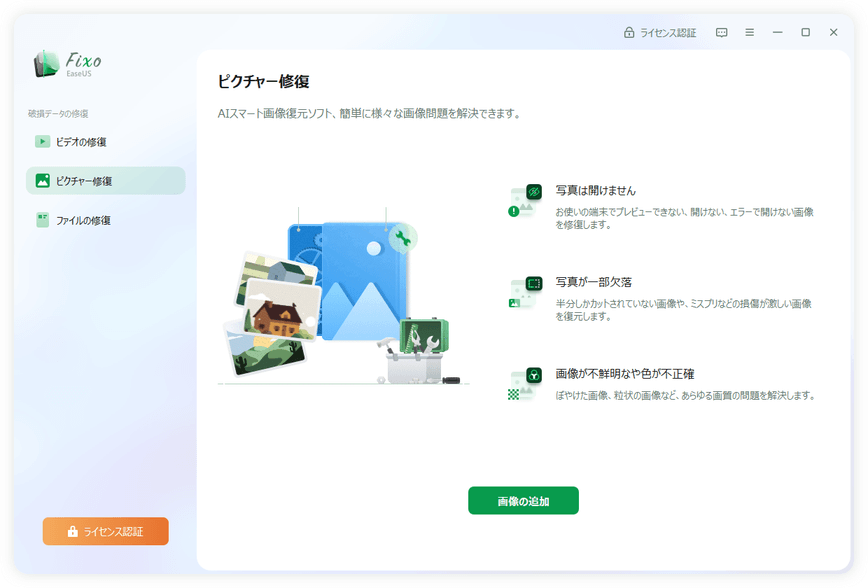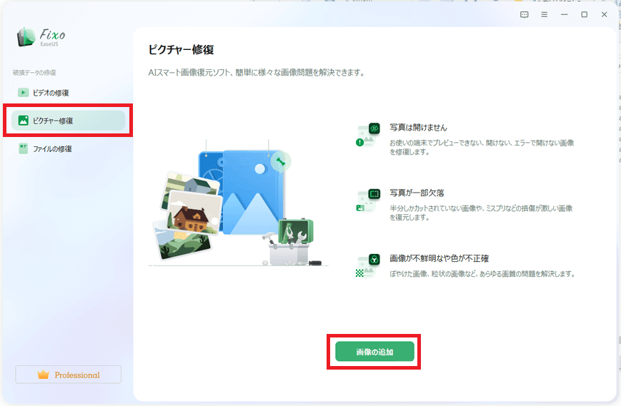 EaseUS Fixoの左のメニューから[ピクチャー修復]をクリックして[画像の追加]をクリックします。