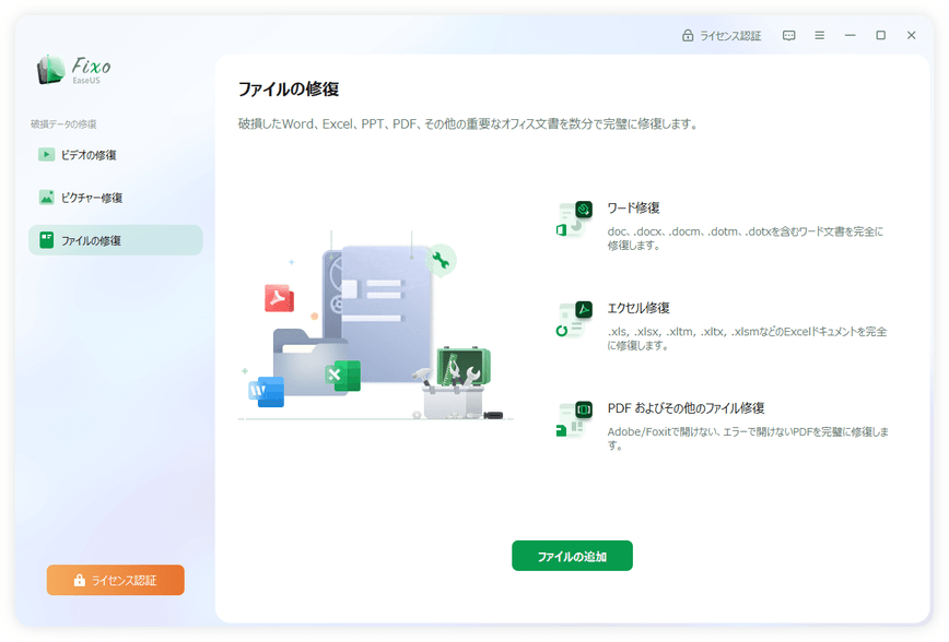 EaseUS Fixoの左のメニューから[ファイルの修復]を選択して[ファイルの追加]をクリックして修復対象ファイルを追加、[データの修復]をクリックします。