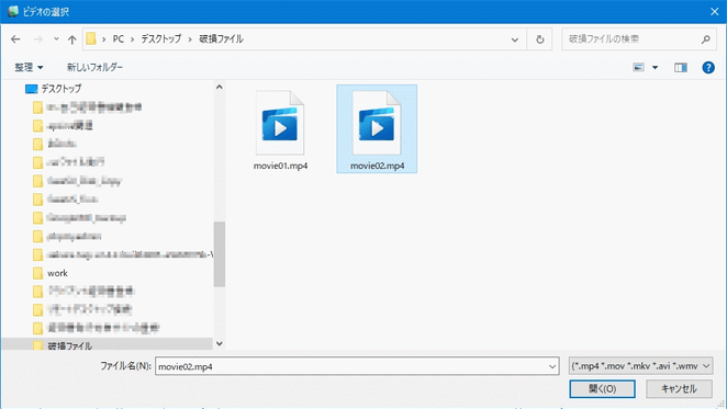 「ビデオの選択」画面が表示されるので、修復したい動画ファイルを選択して[開く]をクリックします。