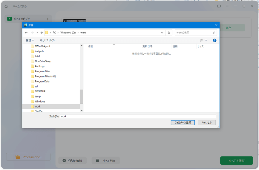 「保存」画面が表示されるので、修復したファイルを保存したいフォルダを選択して[フォルダーの選択]をクリックします。