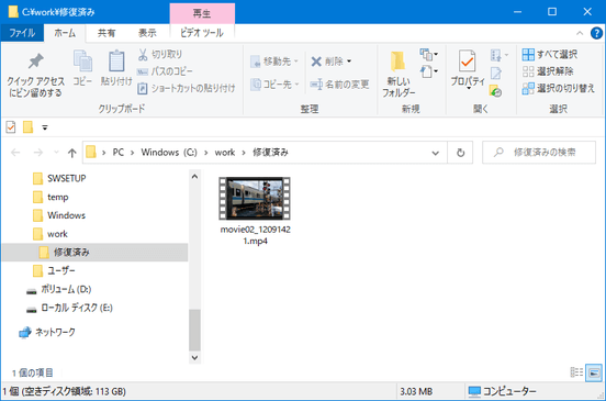 修復されたファイルが保存されているフォルダが開きます。