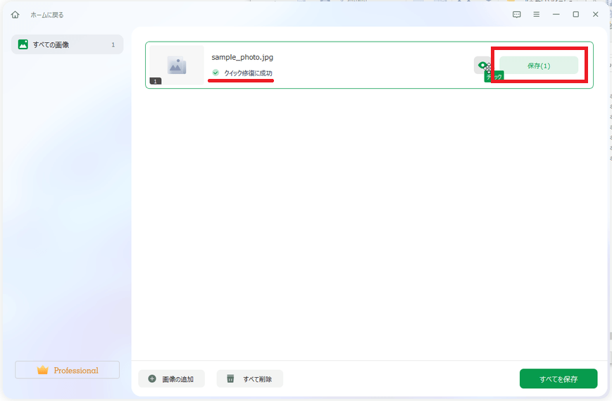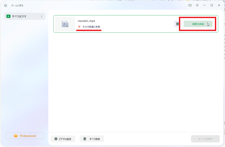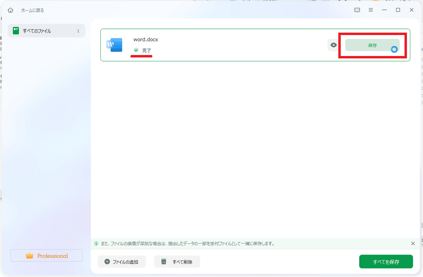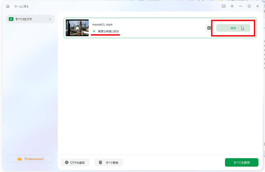 「高度な修復」が成功して追加した全てのファイルの修復が完了したので、[すべてを保存]をクリックして一括保存します。