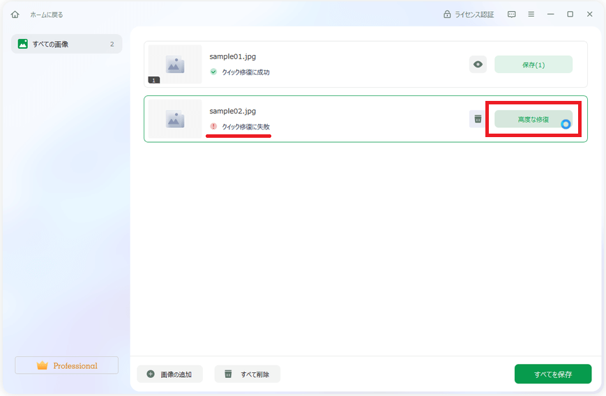 動画ファイルの修復時と同じようにクイック修復で修復できなかったファイルについては「クイック修復に失敗」と表示されます。