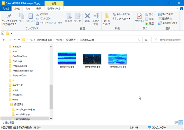 「クイック修復」が成功したものは省略しますが、「高度な修復」を行った画像の保存フォルダを見ると3つのファイルが保管されていることがわかります。