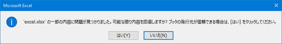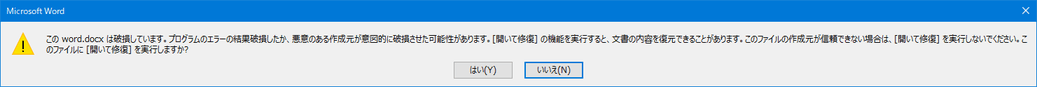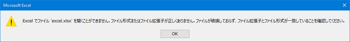 今回修復対象となったファイルは、ファイルを開こうとすると以下のようなメッセージが表示されて開けないファイルとなります。
