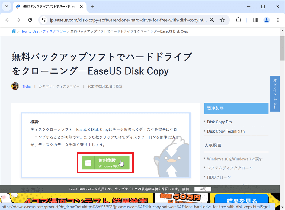 EaseUS Disk Copyのダウンロードサイトを開いて[無料体験]をクリックします。