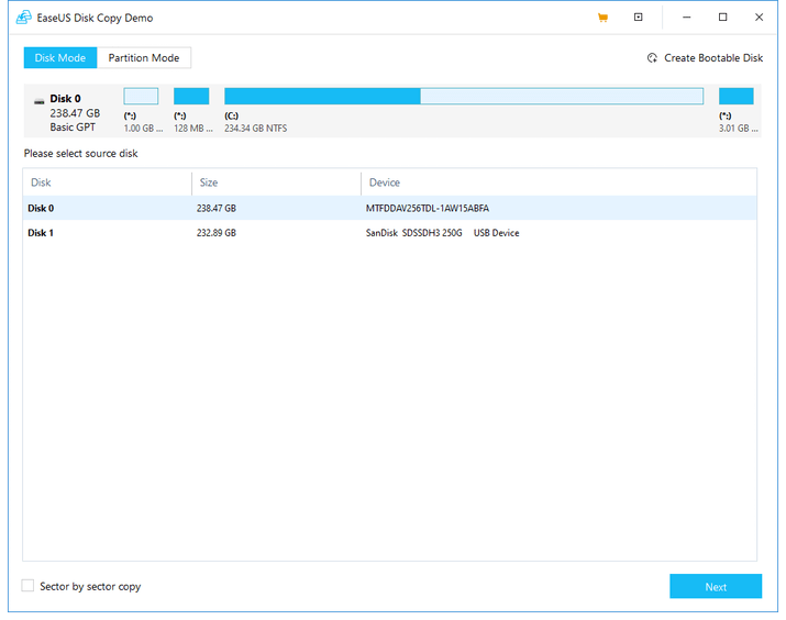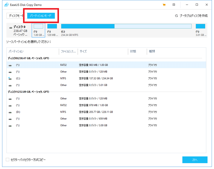 EaseUS Disk Copyを起動して、左上画面のモードで[パーティションモード]をクリックます。