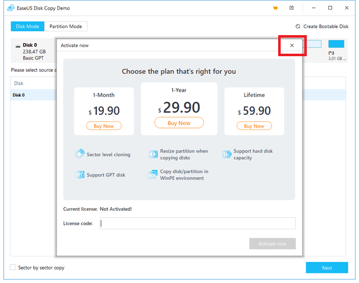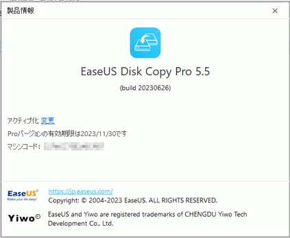 EaseUS Disk Copyでディスクのコピー操作は無償版ではできないため、ライセンス登録して有償版を使用します。