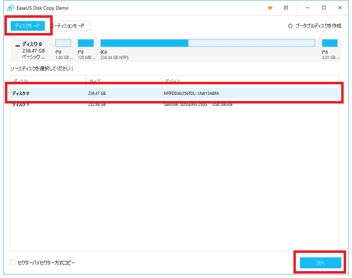 EaseUS Disk Copyの左上画面のモードで[ディスクモード]をクリックし、ソースディスク(コピー元)を選択して[次へ]をクリックします。