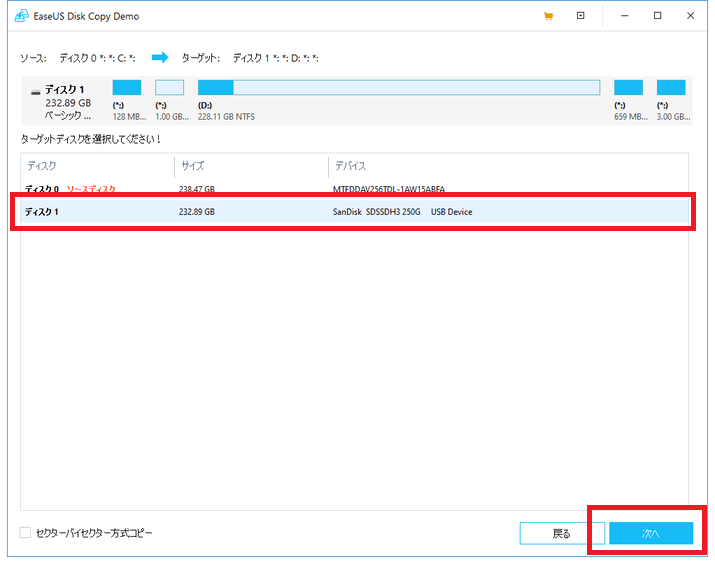 次にターゲットディスク(コピー先)を選択して[次へ]をクリックします。