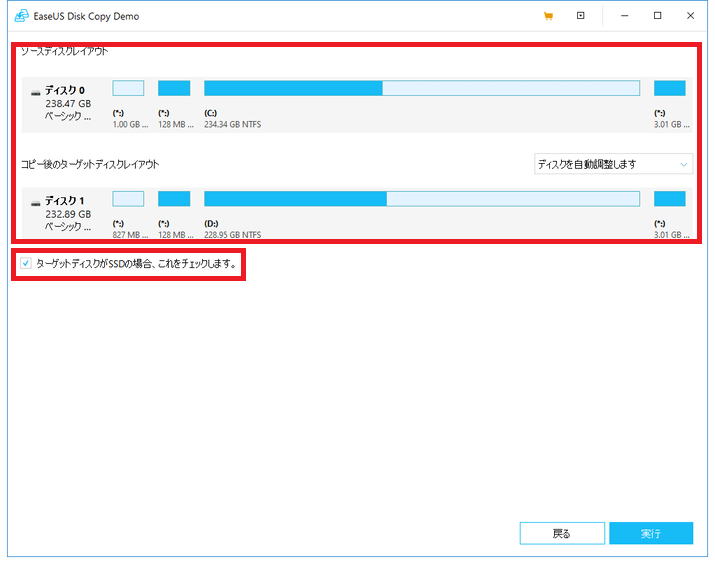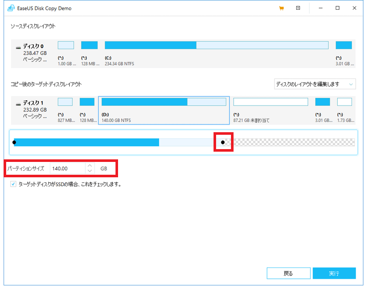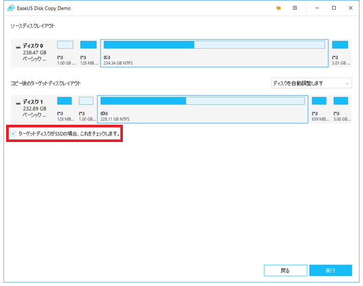 ターゲットディスクがSSDの場合は、「ターゲットディスクがSSDの場合、これをチェックします」のチェックボックスをオンにします。