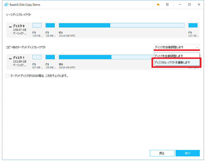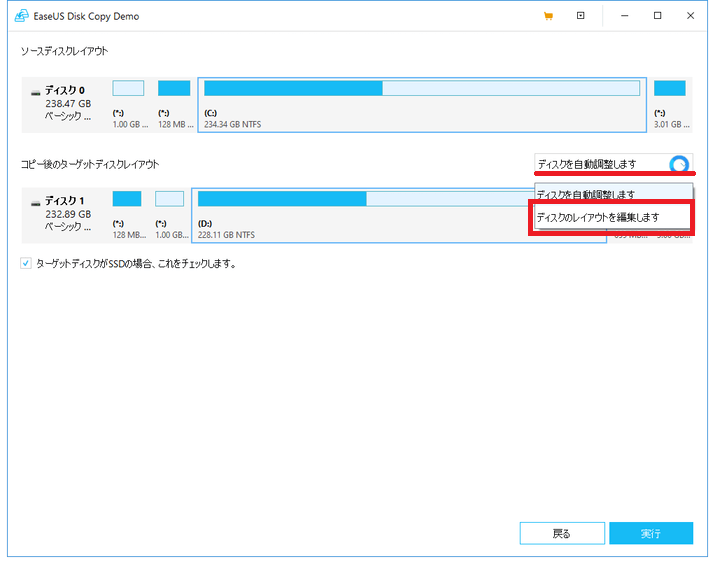 コピー先ディスクのレイアウト(パーティションサイズ、構成)を変更したい場合は、[ディスクのレイアウトを編集します]をクリックします。