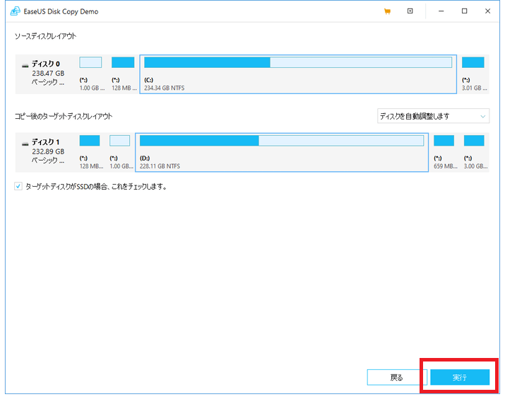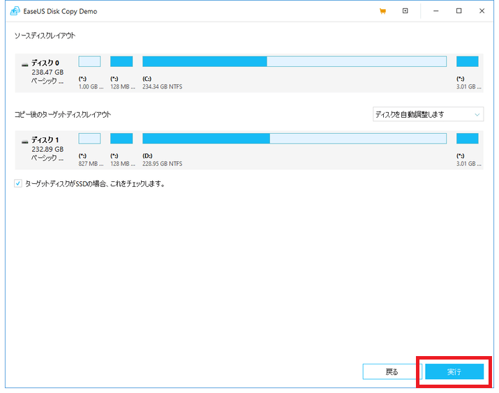 今回は特にディスクのレイアウトは変更せずにそのままディスクをコピーしますので、そのまま[実行]をクリックします。