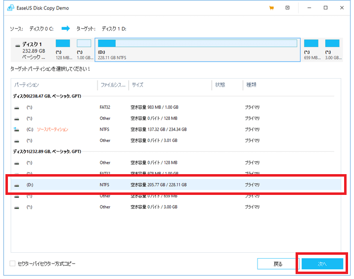 ターゲットパーティション(コピー先ディスクのパーティション)を選択して[次へ]をクリックします。
