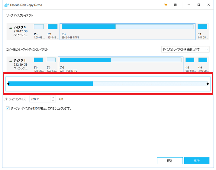 ディスクコピー時にも説明しましたが、ディスクレイアウト(パーティションサイズ)を変更したい場合は、[ディスクのレイアウトを編集します]をクリックします。