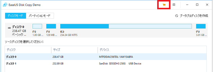 ライセンスの登録は、EaseUS Disk Copy画面右上のショッピングカートのアイコンをクリックします。