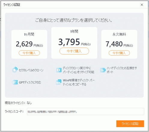[ライセンス認証]画面が表示されるので、[ライセンスコード]に発行されたライセンスキーを入力して[ライセンス認証]をクリックします。