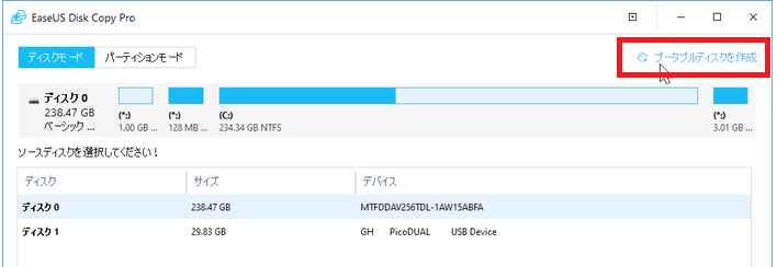 用意しておいたUSBメモリをPCに挿してEaseUS Disk Copy画面右上の[ブータブルディスクを作成]をクリックします。