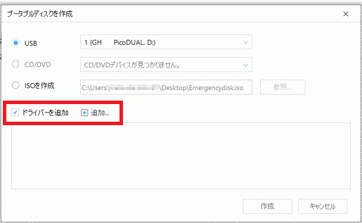 ドライバを追加したい場合は、[ブータブルディスクを作成]画面で[ドライバーを追加]チェックをオンにして[追加]ボタンをクリックします。