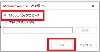[Microsoft WinPEツールが必要です]画面が表示されるので、[Microsoftからダウンロード]オプションをオンにして[OK]をクリックします。