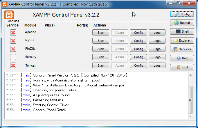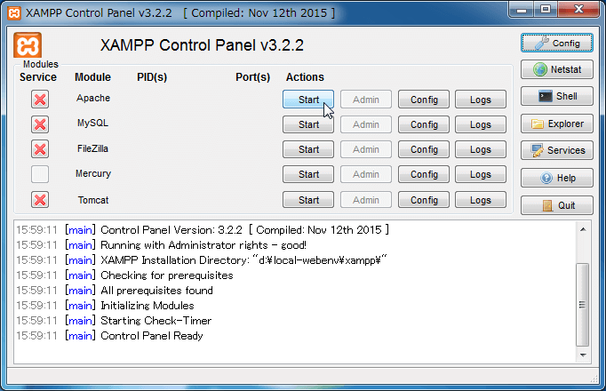 [XAMPP Contorol Panel]の右側に並んだボタンから[Shell]をクリックします。