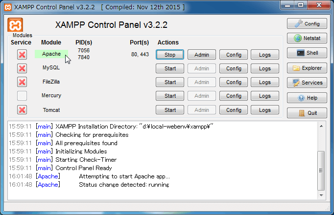 以下の画面のように"Apache"がグリーンになって、[XAMPP Contorol Panel]のログ画面に「[Apache] Status change detected:running」が表示されればApacheが正常に起動されたことになります。