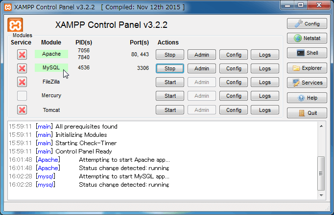 以下の画面のように"MySQL"がグリーンになって、[XAMPP Contorol Panel]のログ画面に「[mysql] Status change detected:running」が表示されればMySQLが正常に起動されたことになります。