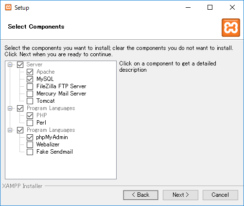 [Select Components]画面が表示されるので、Apache、MySQL、PHP、phpMyAdminのみチェックを付けて[Next >]をクリックします。
