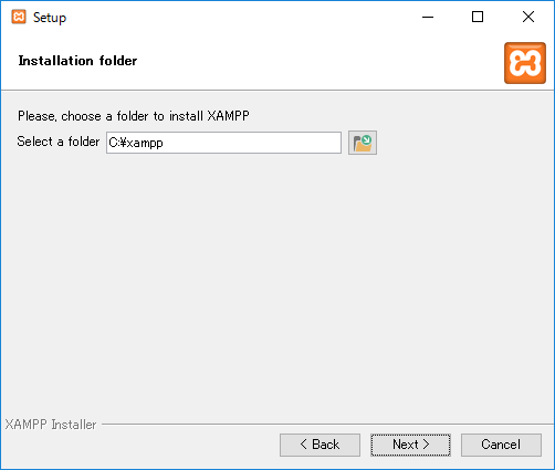 [Installation folder]画面が表示されるのでデフォルトの"C:\xampp"のまま[Next >]をクリックします。 ※インストール先フォルダの指定は任意です。