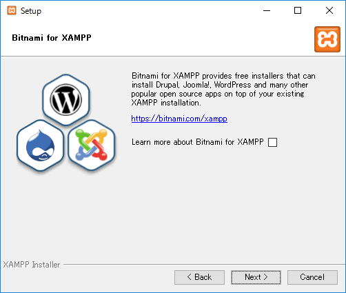 [Bitnami for XAMPP]画面が表示されるので[Learn more about Bitnami for XAMPP]のチェックをオフにして[Next >]をクリックします。