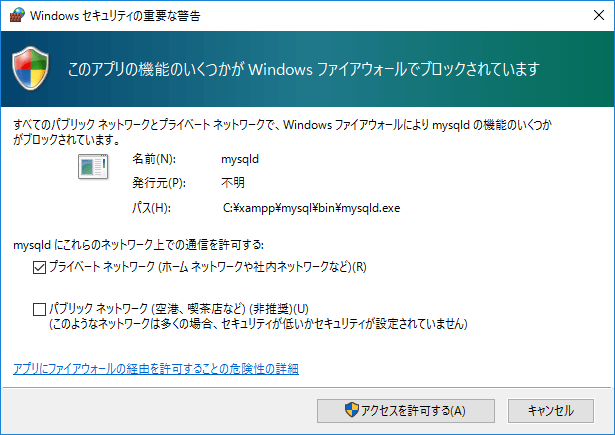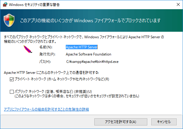 以下のような「Windows セキュリティの重要な警告」画面が表示さたら[アクセスを許可する]をクリックします。