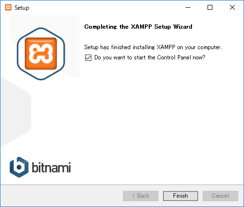 XAMPPのインストールが終了し、[Completing the XAMPP Setup Wizard]画面が表示されたら[Do you want to start the Control Panel now ?]をオンにして[Finish]をクリックします。