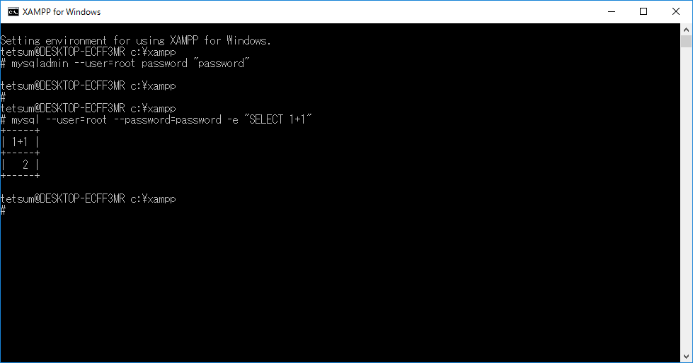 mysqladmin --user=root --password=設定したパスワード -e "SELECT 1+1"
